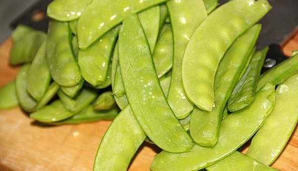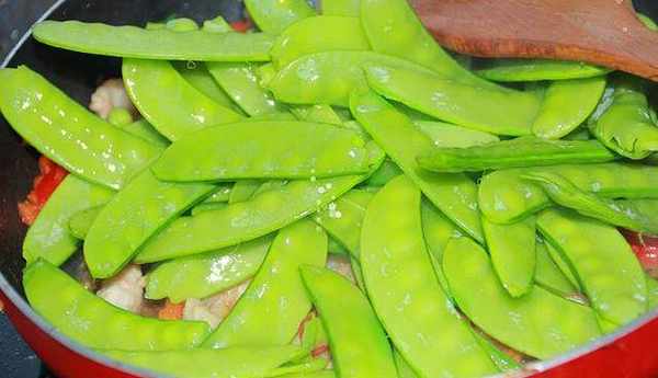 挑選比較嫩的荷蘭豆,把荷蘭豆邊緣的筋撕掉,然後清洗幹凈,用沸水燙煮一下、濾幹水分備用。
