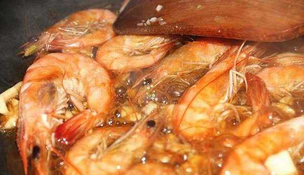 熱鍋裡倒入食用油,油燒熱到七成熱時,倒入處理好的大蝦,快速翻炒至大蝦全身變紅。