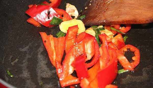 熱鍋裡倒入食用油,油熱後倒入切好的紅椒塊,翻炒片刻。