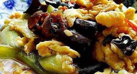 4. 將木耳放入鍋中,再將準備好的絲瓜塊倒入,炒至八成熟時加入炒好的雞蛋,迅速翻炒出鍋。