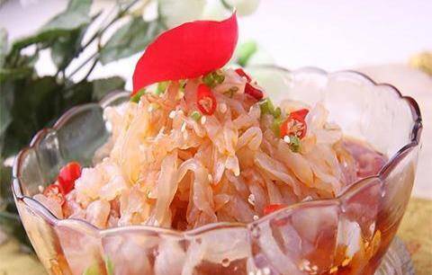 材料:海蜇絲、蒜末、青紅椒、鹽、醋、蠔油、生抽、菜籽油、辣椒油
