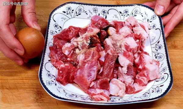 1.將羊肉泡出血水後,擠幹水分,切成2厘米左右的小方塊,裝入盆中,加入生抽、鹽、蛋清、白胡椒粉、蔥薑汁、抓拌均勻,醃制30分鐘,然後再加入淀粉,抓拌均勻。