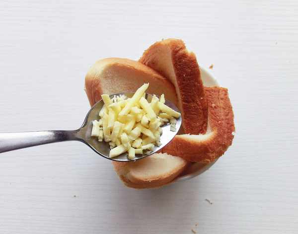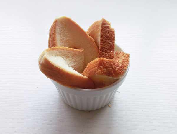5.將面包片小心的放入烤碗中,花瓣錯開擺放。