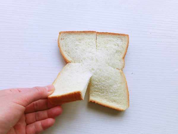 4.土司片用刀在四邊的中心點切口,切到距離中心一半的地方即可,註意不要切斷。