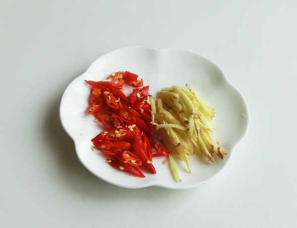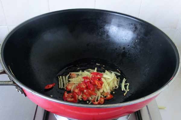 5.鍋中放油,熱後放入薑絲、紅椒片炒香。