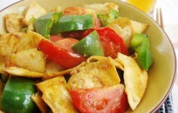 做法:1.白豆腐幹洗凈,切成簿片,西紅柿、綠菜椒切成塊。