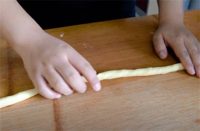 5.捏住兩端提起來,讓它自然纏繞在一起,再提起來,把收口處給捏緊瞭,這樣這個麻花就做出來瞭。