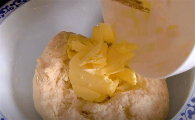 1.一斤面粉,6g酵母粉,2g食鹽,60g白糖,10g蜂蜜,200毫升溫牛奶和面,簡單揉成團,給它撕開一個口子,這是50g室溫軟化的黃油。