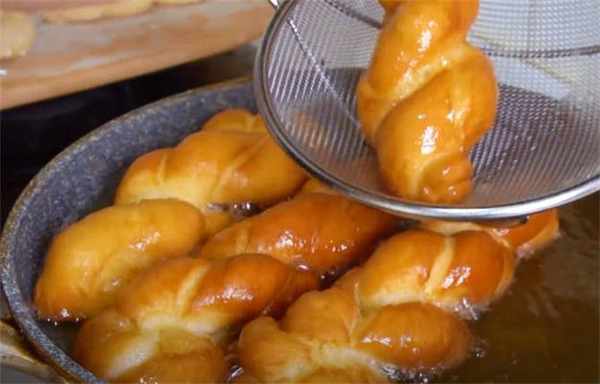 7.餳好之後油溫七成熱下鍋,這個火不能太大瞭,咱們全程中火炸,炸麻花的時候顏色上的特別快,一定要及時翻面,炸到金黃浮起出鍋。