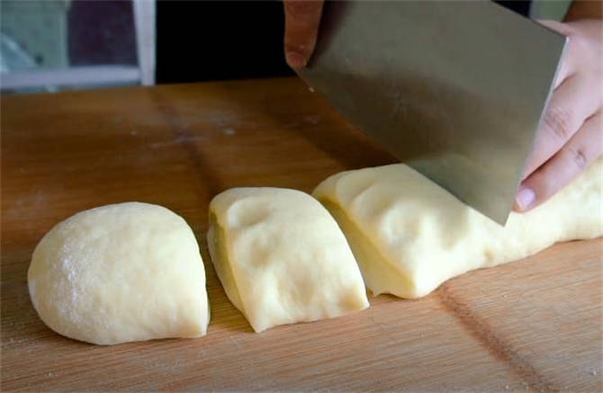 3.這個面滿滿發瞭一大盆,案板上撒些幹面粉,按壓給它排排氣,揉成長條後切成小面劑。