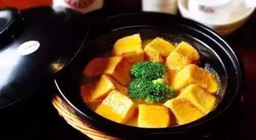 3.色拉油燒至8成熱,將豆腐塊10塊,下鍋炸至金黃色,瀝凈油後擺在燒熱的砂煲中。