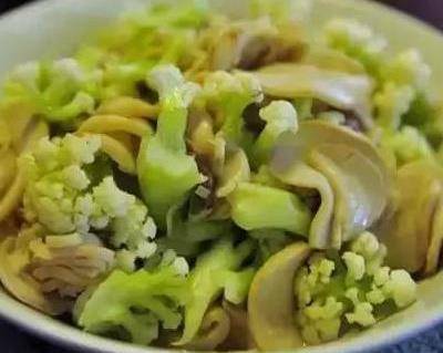 食材:雞胸肉、菜花、蔥絲、薑末、大料、食用油、料酒、鹽、雞精、蠔油、粉芡。