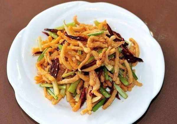 8.下辣椒絲炒至,再下魷魚絲煸炒