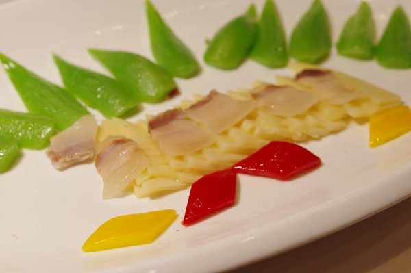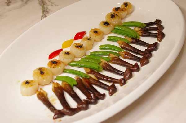 點綴魚子醬的扇貝肉,蜜豆和黑雞樅,各有各的鮮