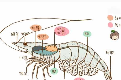其實我們要知道蝦頭到底能不能吃,就必須瞭解蝦頭的結構,如下圖所示,蝦頭裡面有蝦胃、蝦肝、卵巢(蝦黃)、鰓、蝦眼、額角,而這些部位其實都是可以食用的,但是鰓的口感比較差,我們吃的時候,只需要將鰓去掉即可(如果是油炸的大蝦,就沒有必要去除了,因為炸脆了,吃著口感也是很不錯的)。而很多人愛吃的蝦黃,其實是蝦的卵巢,這部位的營養價值非常高,建議大家吃大蝦時,一定要將蝦黃吃掉。