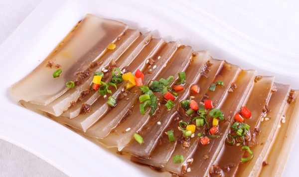 這個肉皮凍是東北人的專利,這個還算好,到現在都應該還是受歡迎的。能美容養顏的東西,總是很長久的。新鮮的猪皮兩面都剔除乾淨,經過焯水後再加水熬煮,至少要煮三個小時以上,最後冷卻成果凍的樣子,放凉切片吃。要蘸上蒜泥還算正宗。現在豬皮凍常見,但蘸蒜泥不常見了!