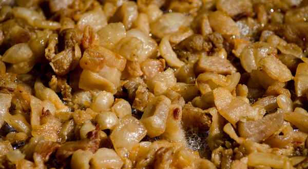 從前,人們的生活水準都有限,會用這個熬炒出來的猪油來補貼豆油吃,但這個最後剩餘的油梭子才是孩子們和愛喝酒的大人們的最愛!