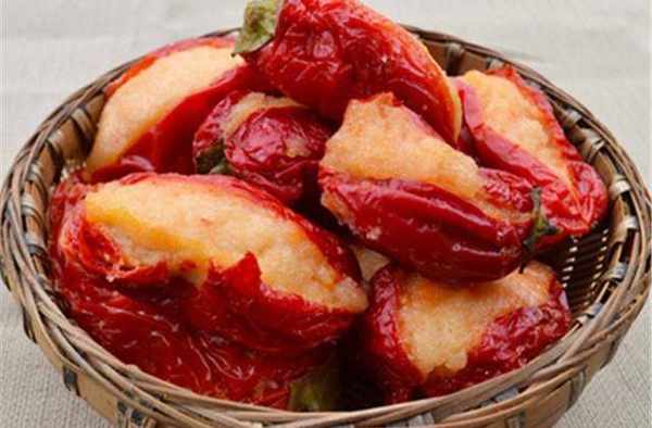 第二步:醃制“灌辣椒”。首先我們需要將辣椒洗幹凈,劃開辣椒的一邊,去掉辣椒把和辣椒籽,將糯米面和粘米面按照一定的比例混合,攪拌均勻後加入食鹽、花椒粉繼續攪拌,和勻,灌到做過處理的辣椒裡,包緊。將包好的辣椒放壇子裡,密封,“灌辣椒”醃制的時間比較長,一般需要半個月到20天左右的樣子,等到“灌辣椒”發酵後才能取出。