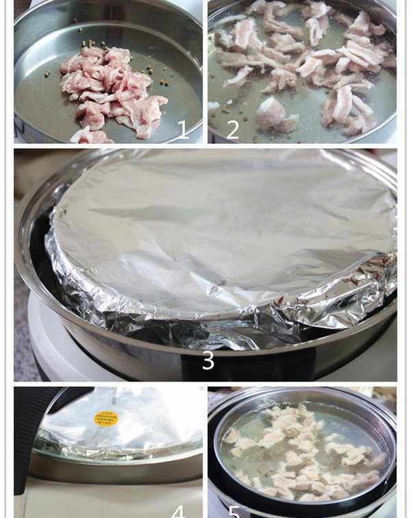 豬頸肉清洗幹凈切片,蒸碗裡放入洗幹凈的白胡椒粒、肉片,自動烹飪隔水蒸33分鐘左右,蒸制結束,戴專門隔熱手套打開鍋蓋和錫紙,把湯連蒸碗一起取出,加入鹽、花生油和蔥花。