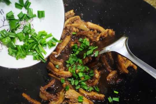 10.最後倒入蒜葉,翻炒一下,即可出鍋。