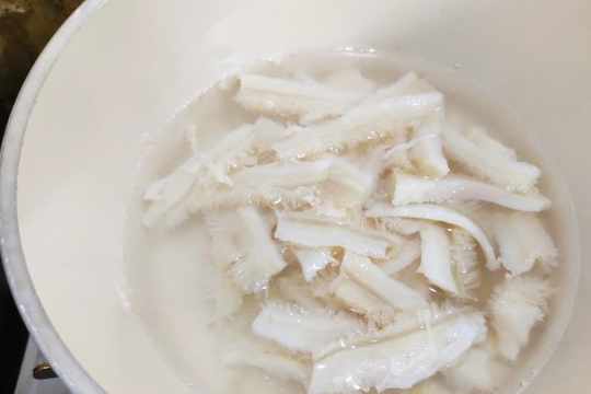 2.鍋中加入清水煮開,放入切好的牛肚,汆燙一下。然後撈出沖洗一遍,瀝幹水分。