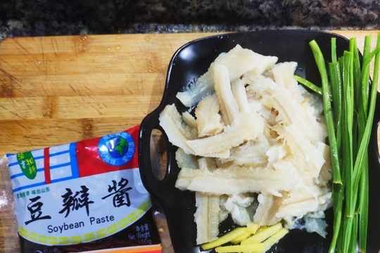 牛肚100克、蒜葉15克、豆瓣醬1大勺、料酒5克、白糖5克、生抽5克、花生油適量、薑絲3克