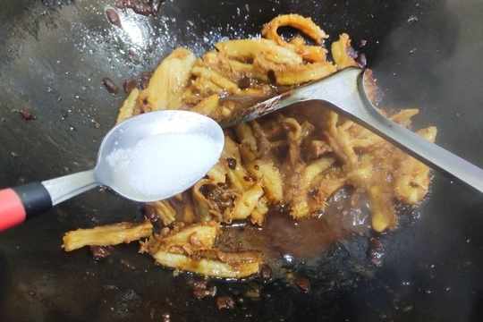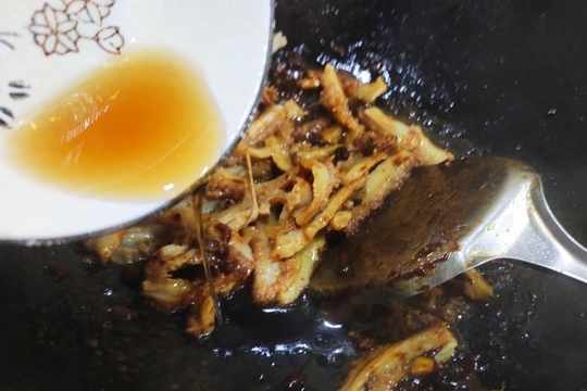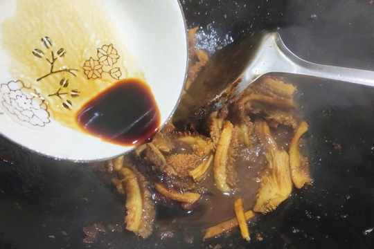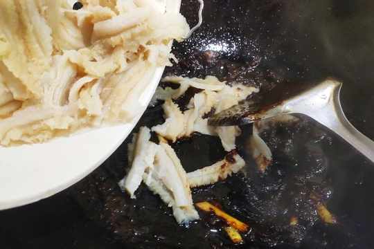 6.倒入瀝幹水分的牛肚,翻炒均勻。(時間不要長,充分裹上豆瓣醬即可)