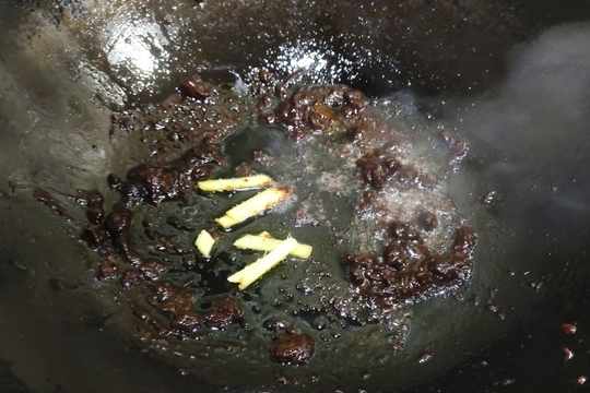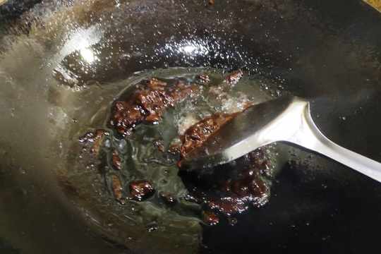 4.起鍋熱油,下入豆瓣醬,炒香。
