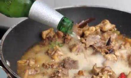 這時可以起鍋,往鍋中倒入適量的食用油大火燒開,等油溫上來後將焯好水的雞肉塊倒入鍋中翻炒幾下。將雞肉炒出香味之後往鍋中放入適量的薑片,八角,香葉,桂皮,大蒜子,小辣椒,使用鹽,白胡椒,老抽,蠔油,翻炒至湯汁炒幹,然後往鍋中倒入一瓶啤酒。啤酒倒入鍋中之後改中小火燉煮30分鐘左右。