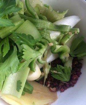 倒醬油料酒咸鹽醃制20分鐘薑蒜花椒倒入一個碗裡備用,蔥和青椒裝入另一個碗裡備用