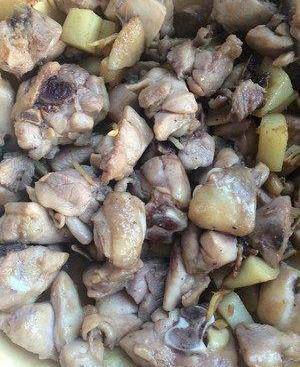 鍋中倒油。量要多一點,能沒過雞丁最好,燒熱,下雞丁炸至金黃澇出放涼