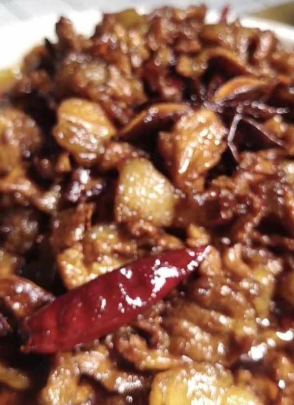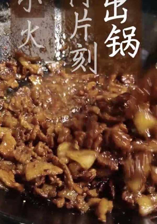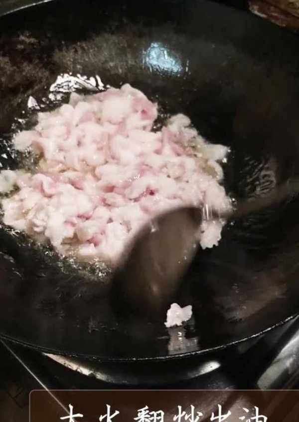 2、熱油鍋,先下肥肉,大火翻炒出油,加入幹料翻炒。放瘦肉繼續翻炒,加老抽調色調味。