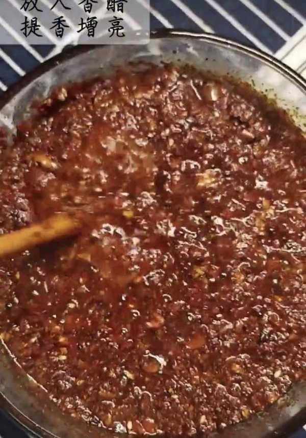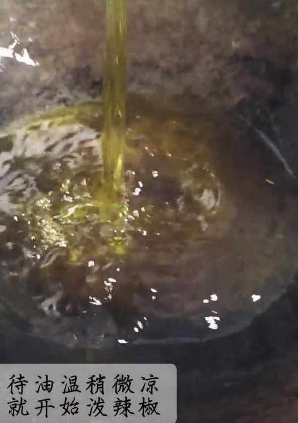 4、待油溫稍微涼,就開始潑辣椒,反復攪拌,避免焦糊,放入香醋,提香增亮。油潑辣子,拌涼菜、燒菜、吃面條都可。