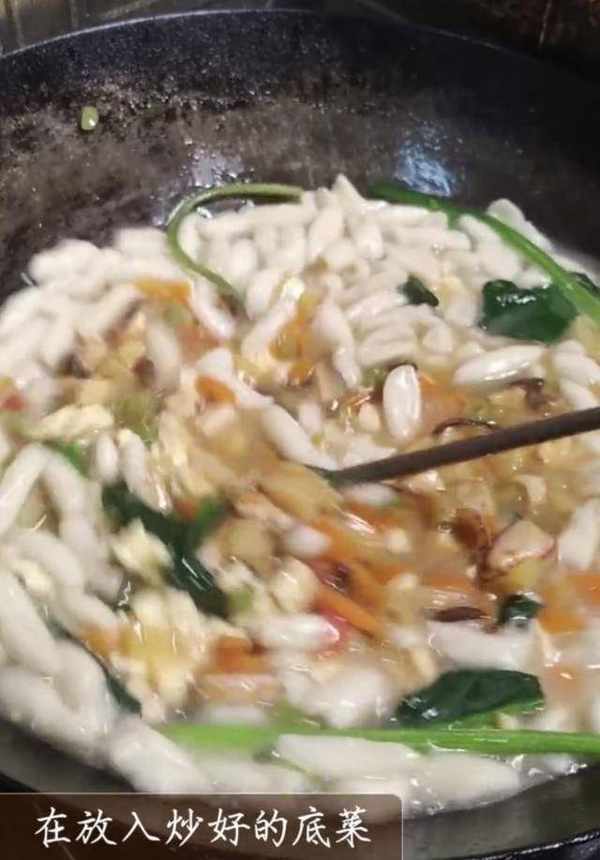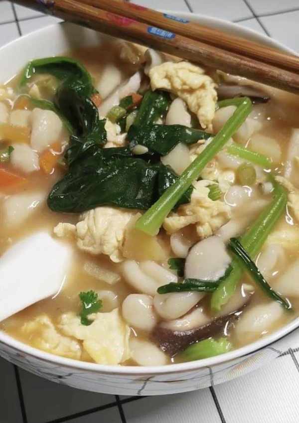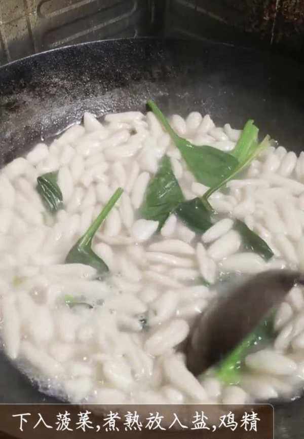 6、鍋裡開水,下入麻食,煮兩開,下入菠菜,煮熟後放入鹽、雞精,喜歡吃醋的話可以放香醋。