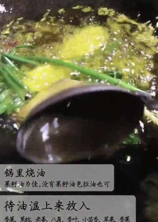 2、鍋裡燒油(菜籽油最佳,沒有菜籽油,色拉油也可),待油溫上來放入(香菜、蔥結、老薑、八角、香葉、小茴香、草果、香菜)。