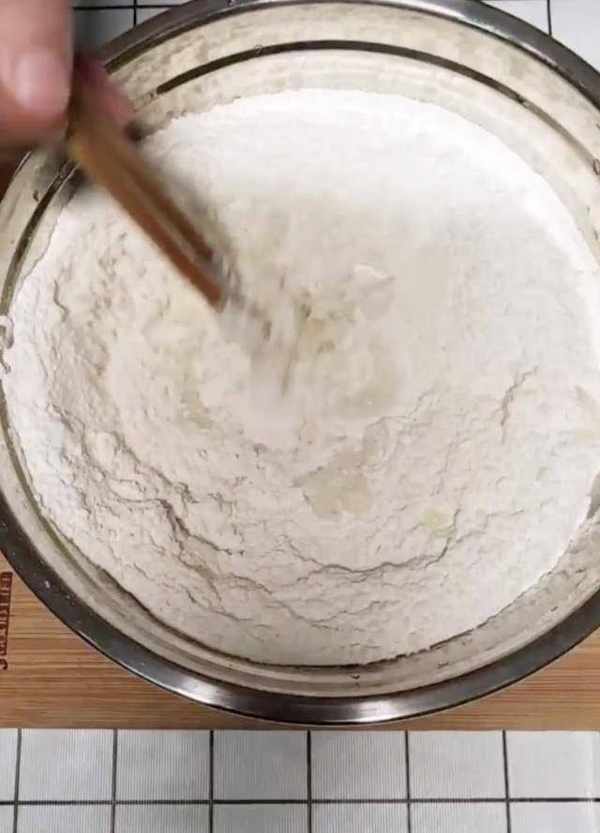 1、溫水加少許食用鹽和面(水和面的比例是2:1),攪拌成絮狀。