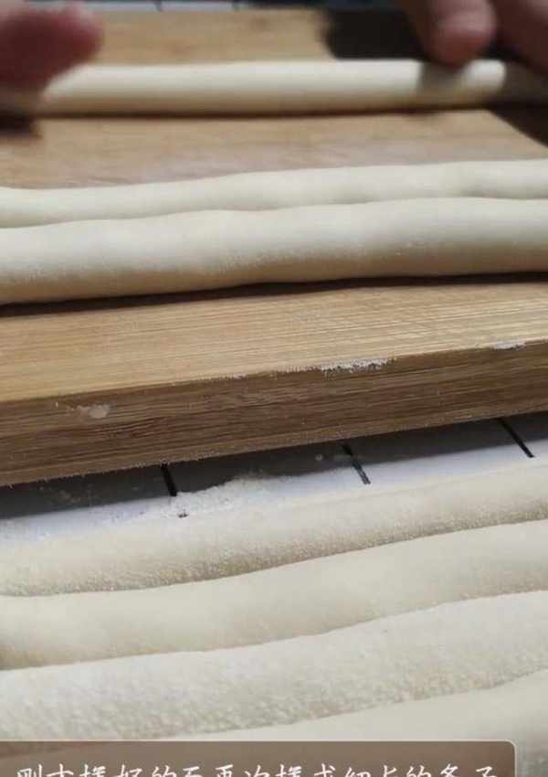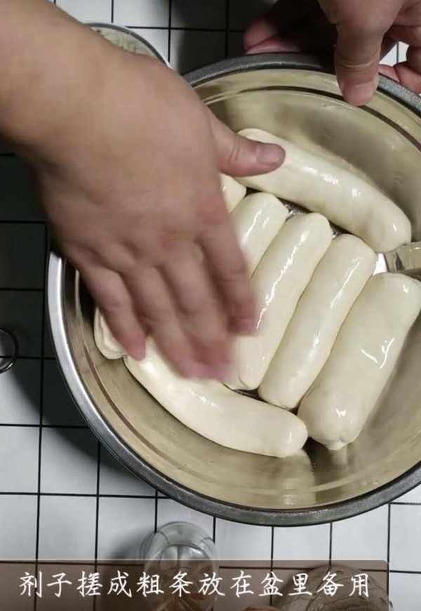 3、把揉好的面掐成劑子,盆地均勻抹食用油(抹油可以防止面粘在一起),劑子搓成粗條放在盆裡備用。
