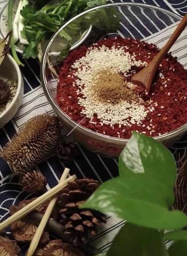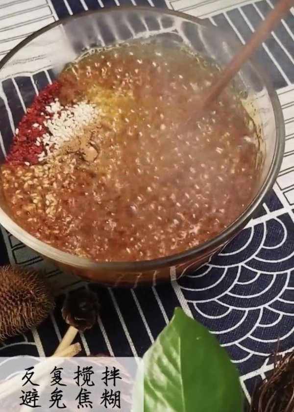 1、準備辣椒粉(陜西線線辣子磨成的辣椒粉為佳,香而不辣),裡面放上白芝麻和五香粉。