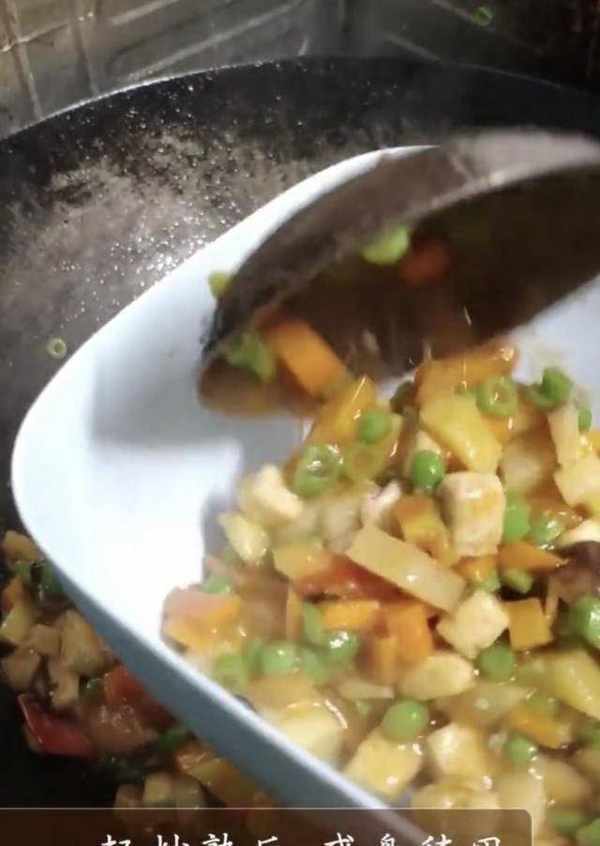 4、準備自己喜歡吃的菜,依次炒熟蔬菜,有雞蛋、豆腐、蘑菇、土豆、西紅柿、青菜,一起炒熟後,盛盤備用。