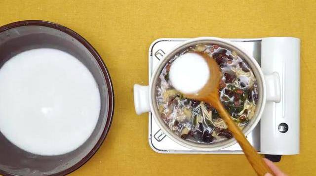 再放粉條,用大火煮開後保持中小火,準備好面筋水,把鍋底的粉攪開,舀上一勺放入湯鍋裡,邊舀邊攪,直到湯汁變得濃稠,胡辣湯就差不多瞭。最後撒入大量的胡椒粉,兩勺生抽,攪拌均勻就完成瞭。這一碗胡辣湯就做好瞭,吃的時候加入陳醋、香油。拌一拌就可以開動瞭。