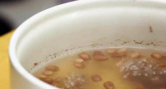 把牛肉丁和花生放入鍋裡,倒入小半鍋水,煮開後再煮15分鐘,接著將牛肉撕成小塊放進湯裡。放入海帶絲、豆腐皮和木耳。
