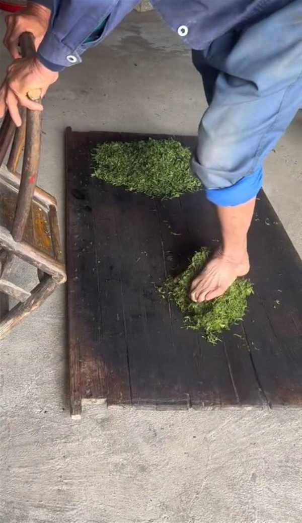 在這個短視頻博主發佈的視頻裡,一位村民扶著凳子,赤著雙腳反復踩捻茶葉。他告訴博主,踩茶是為瞭讓茶葉更細。這是湖南部分地區一直保留的傳統制茶工藝。平江當地的茶農陳先生在回應媒體時解釋說,因為使用一芽兩葉或一芽三葉的鮮葉原料制作“煙茶”,所以才產生瞭用腳揉制的方法。按照傳統,制茶前要燒香拜茶神,制茶人之前一周就要開始打赤腳,還要用香灰洗腳,保證腳的幹凈。