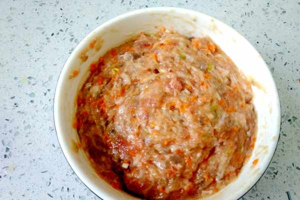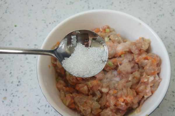 第五步:肉餡剁好之後裝入碗中,加入一個雞蛋清、一勺食鹽調味、半勺白糖提鮮,除此之外不用添加其它的調味料,以免破壞肉餡的鮮味。