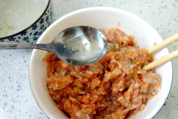 第六步:接下來分多次少量的加入泡好的葱薑水,邊加邊攪拌,沿著一個方向攪拌,給肉餡上勁兒的同時,讓餛飩餡喝足水分,這樣餛飩餡就會非常的嫩。