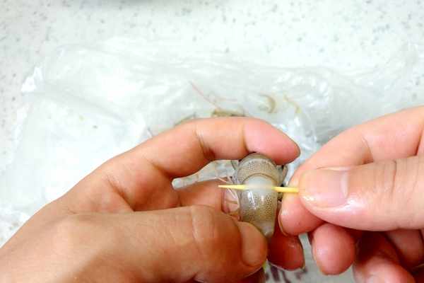第二步:選擇大蝦的時候,不要選擇那些死的凍蝦,挑選那些活蹦亂跳的鮮蝦,這樣的蝦肉做餛飩吃起來非常的鮮,而且肉質十分的Q彈好吃。鮮活的大蝦,沿著二、三關節處用牙籤挑出蝦線,並且剝出裡邊的蝦仁。