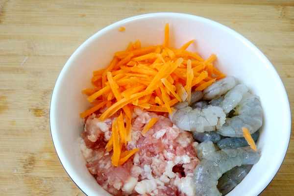 食材:裡脊肉200克、活蝦200克、胡蘿蔔1根、生薑少許、香葱少許、香菜少許、蝦米少許、雞蛋1個、香油適量、清水適量、食鹽適量、白糖少許