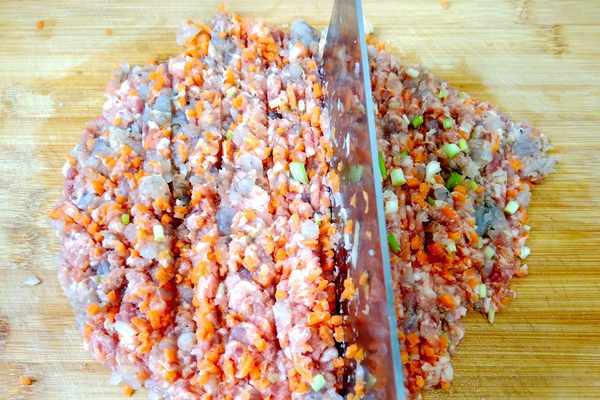 第四步:剁餡,把裏脊肉丁、胡蘿蔔絲、蝦仁、少許蔥花放在案板上,用菜刀不停地來回剁,把這些餡料的黏性給剁出來,這樣剁出來的餛飩餡吃起來肉香味十足,更好吃。