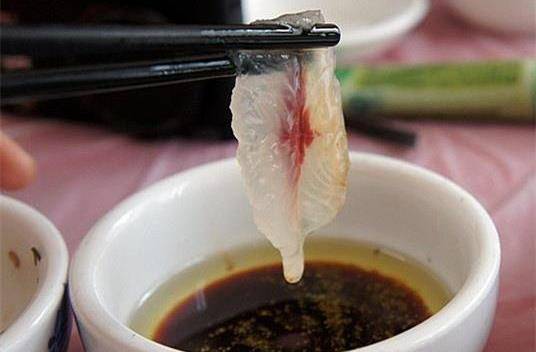 草魚先切去尾巴放入水裡讓它遊5分鐘左右,這樣的目的是放血。然後草魚去掉鱗片,片出魚肉,刀一定要利,否則不好操作。魚肉分開後去皮,然後用廚房用紙包住魚肉1分鐘左右。這樣的目的是為瞭吸去魚肉的血水,做出來的魚生不腥。菜板用洗潔清清洗幹凈,用熱水蕩一下,然後用廚房用紙把菜板菜刀擦幹。切魚片最好切2毫米左右的厚度,切薄瞭手的溫度會影響魚肉的口感,切太厚瞭不入味。切好的魚片馬上放入冰箱急凍。