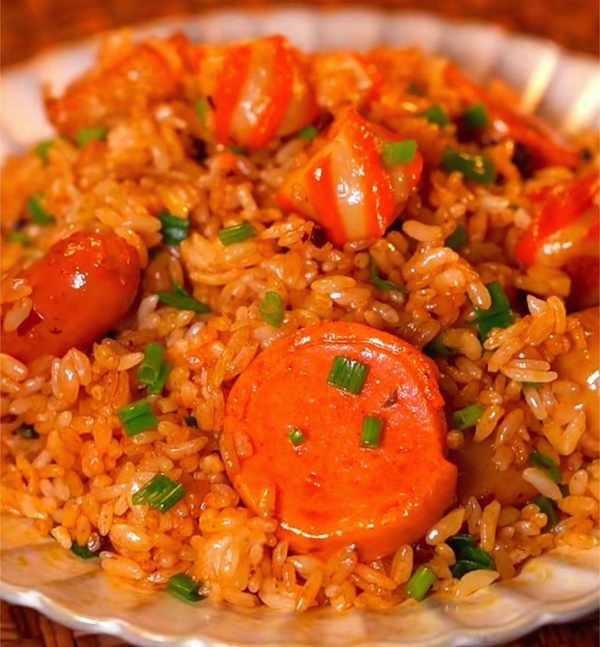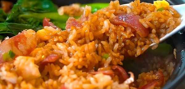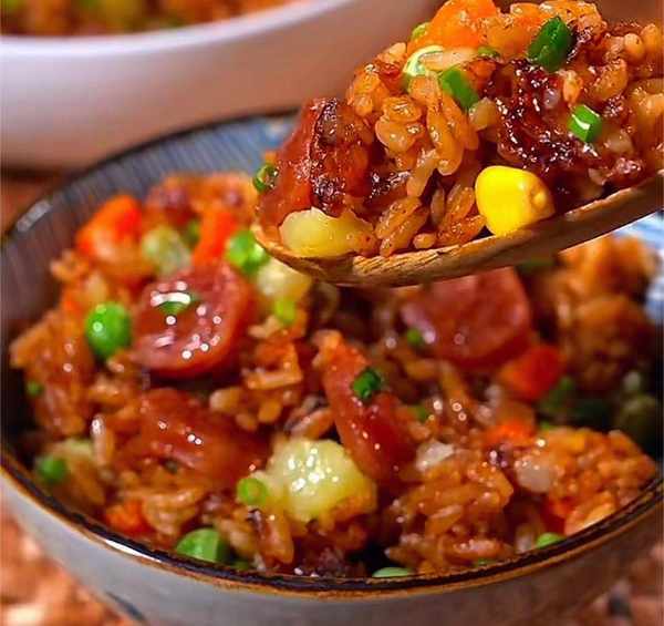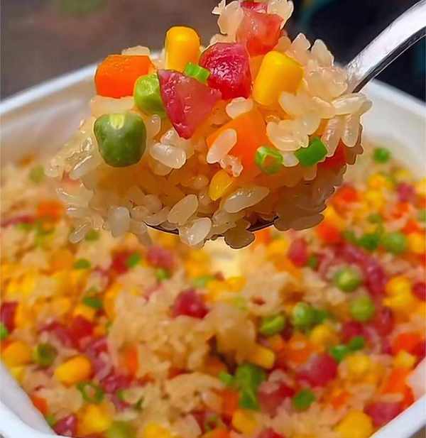 步驟三:適量的大米淘洗幹凈放入電飯鍋中,加兩勺生抽、一勺蠔油、一勺老抽、一勺老幹媽、適量的雞精、白糖調味,攪拌均勻,再把準備好的五花肉片、玉米粒、胡蘿卜丁、香菇丁、長豆角擺在大米上,加入適量的水,淋入適量的食用油,蓋蓋煮飯鍵即可。出鍋撒點蔥花,翻拌均勻即可。如果覺得米有點軟的,可以攪拌均勻之後,再蓋上鍋蓋燜一會兒,米飯就會粒粒分明。