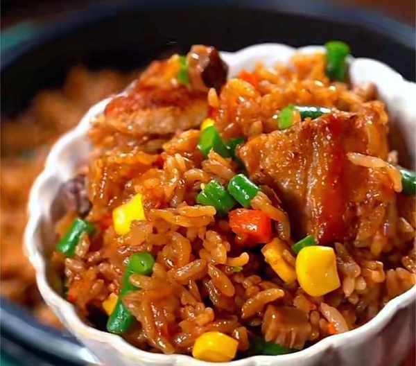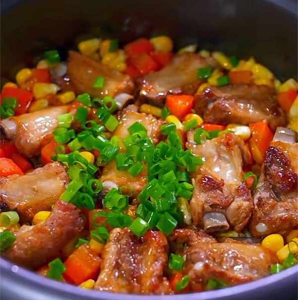 步驟二:適量的大米淘洗幹凈,倒入電飯鍋裡,加入煎好的排骨、玉米粒、胡蘿卜丁、一包燜飯醬,加水沒過食材,煮飯鍵。出鍋撒點蔥花,攪拌均勻,美味即成。
